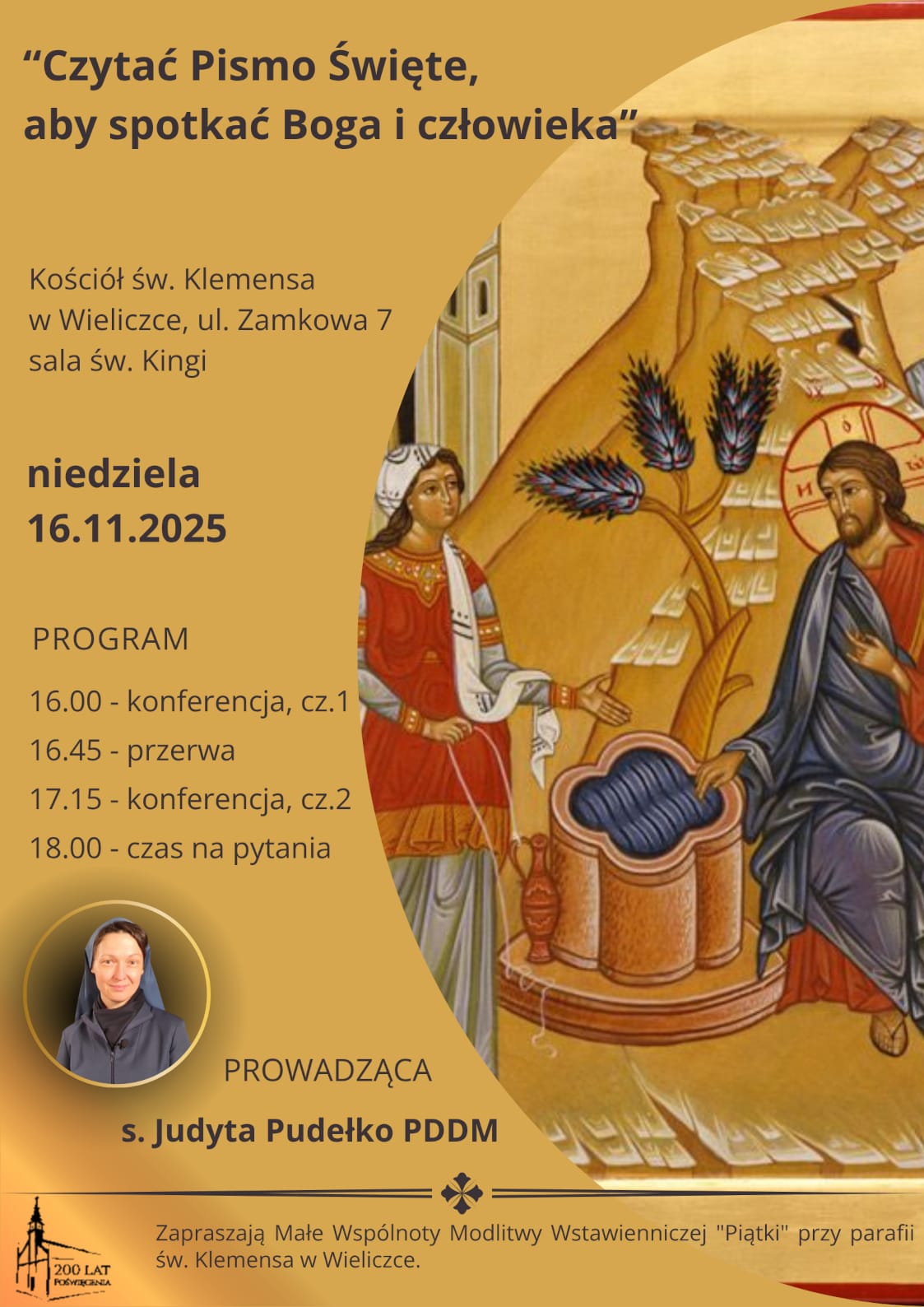 Serdecznie zapraszamy w niedzielę 16.11.2025, na spotkanie z S. Judyta Pudełko, która wygłosi konferencję pt. „Czytać Pismo Święte, aby spotkać Boga i człowieka”. Spotkanie rozpocznie się o godz. 16.00 w sali św. Kingi.