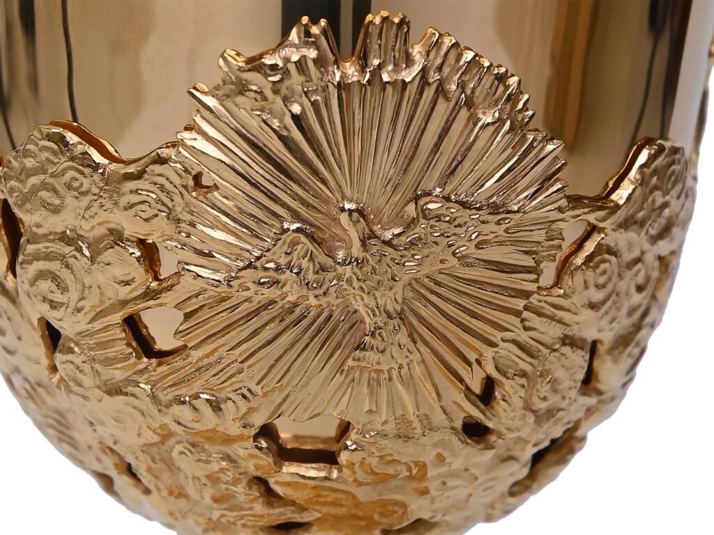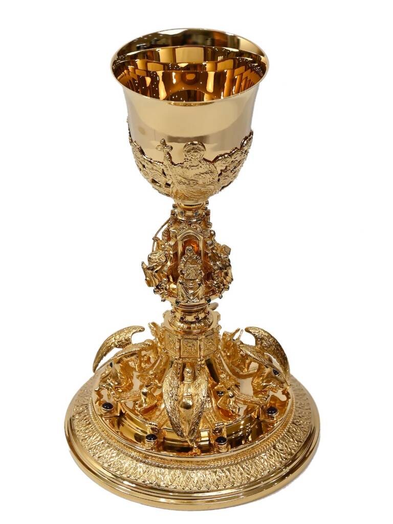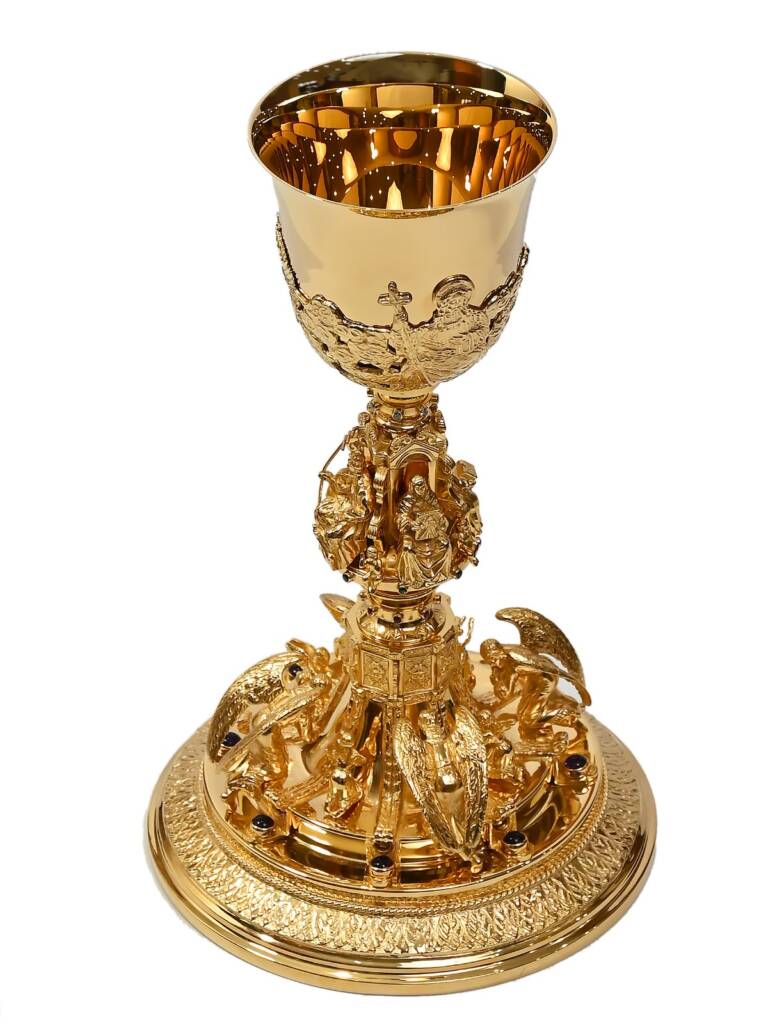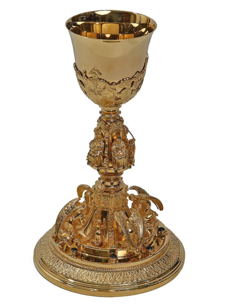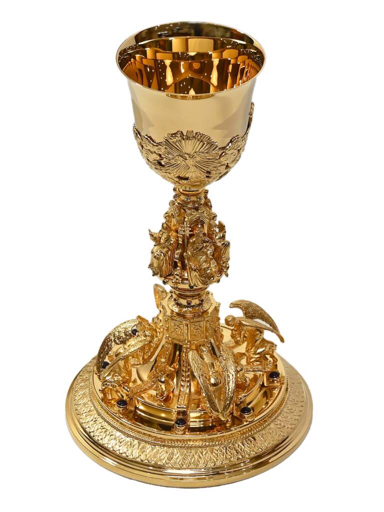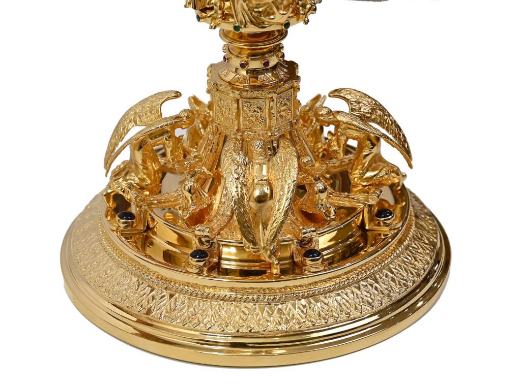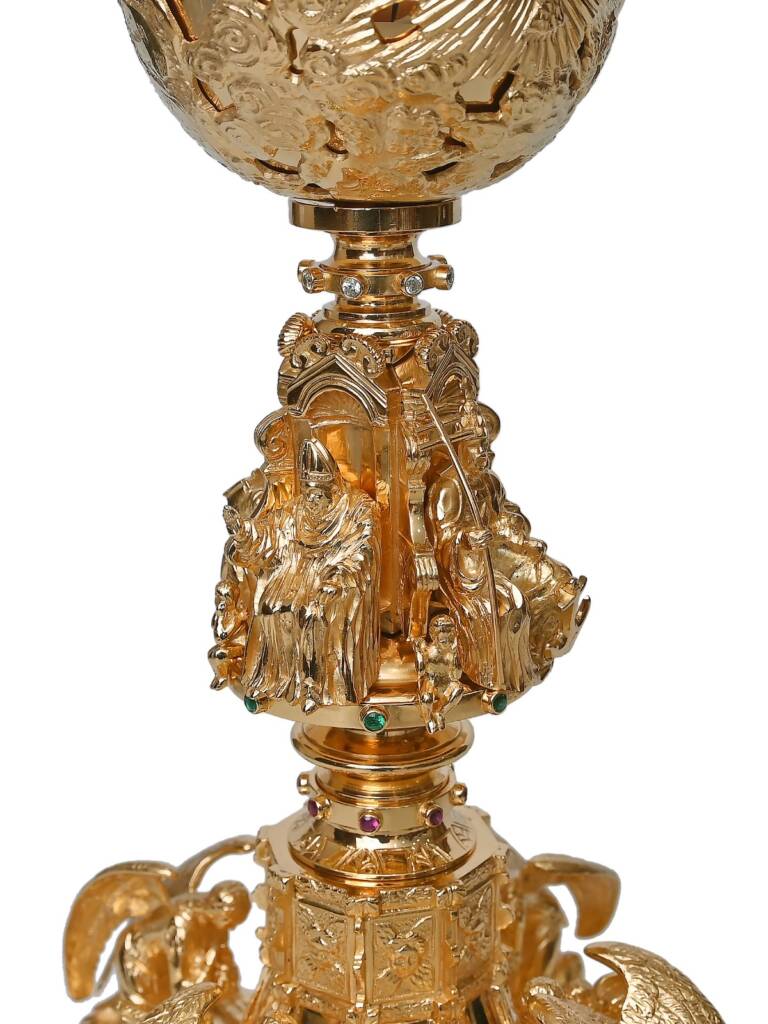 Na stopie kielicha umieszczono figurki aniołów adorujących Najświętsze Postacie, by przypominać, że podczas Mszy Świętej ziemia łączy się z niebem, a liturgia staje się misterium uczestnictwa w Boskiej rzeczywistości.