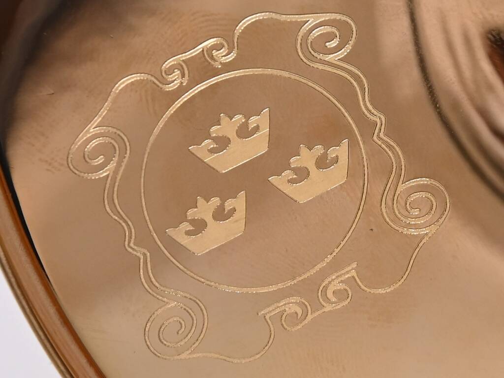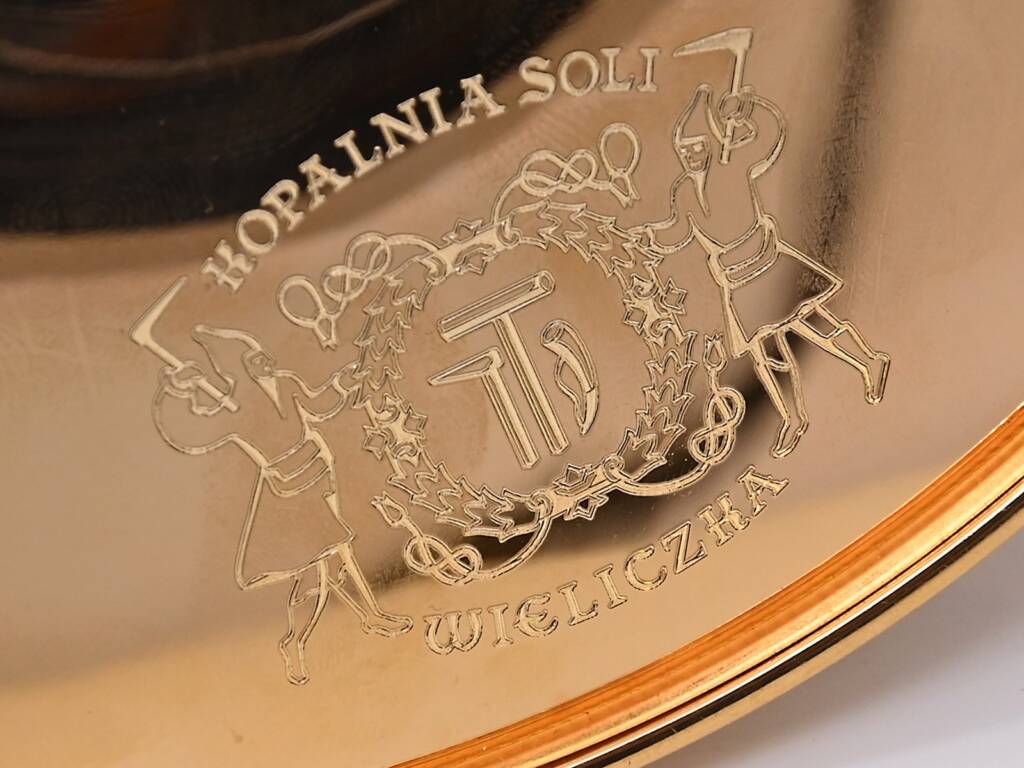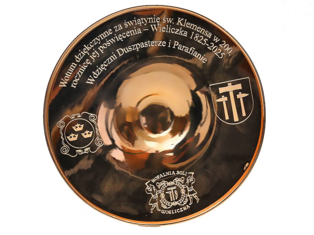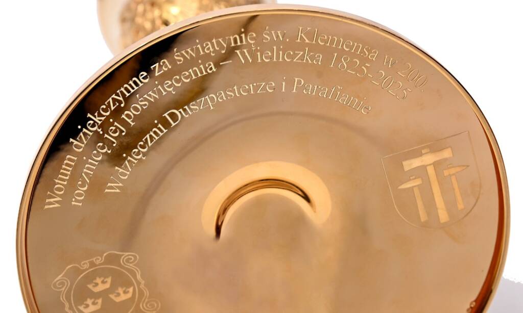 Na spodzie kielicha widnieje starannie wykonany grawer trzech herbów: Parafii św. Klemensa, Miasta Wieliczki oraz Kopalni Soli – instytucji i wspólnot, które współtworzą duchową i historyczną tożsamość parafii. Obok herbów umieszczono inskrypcję: